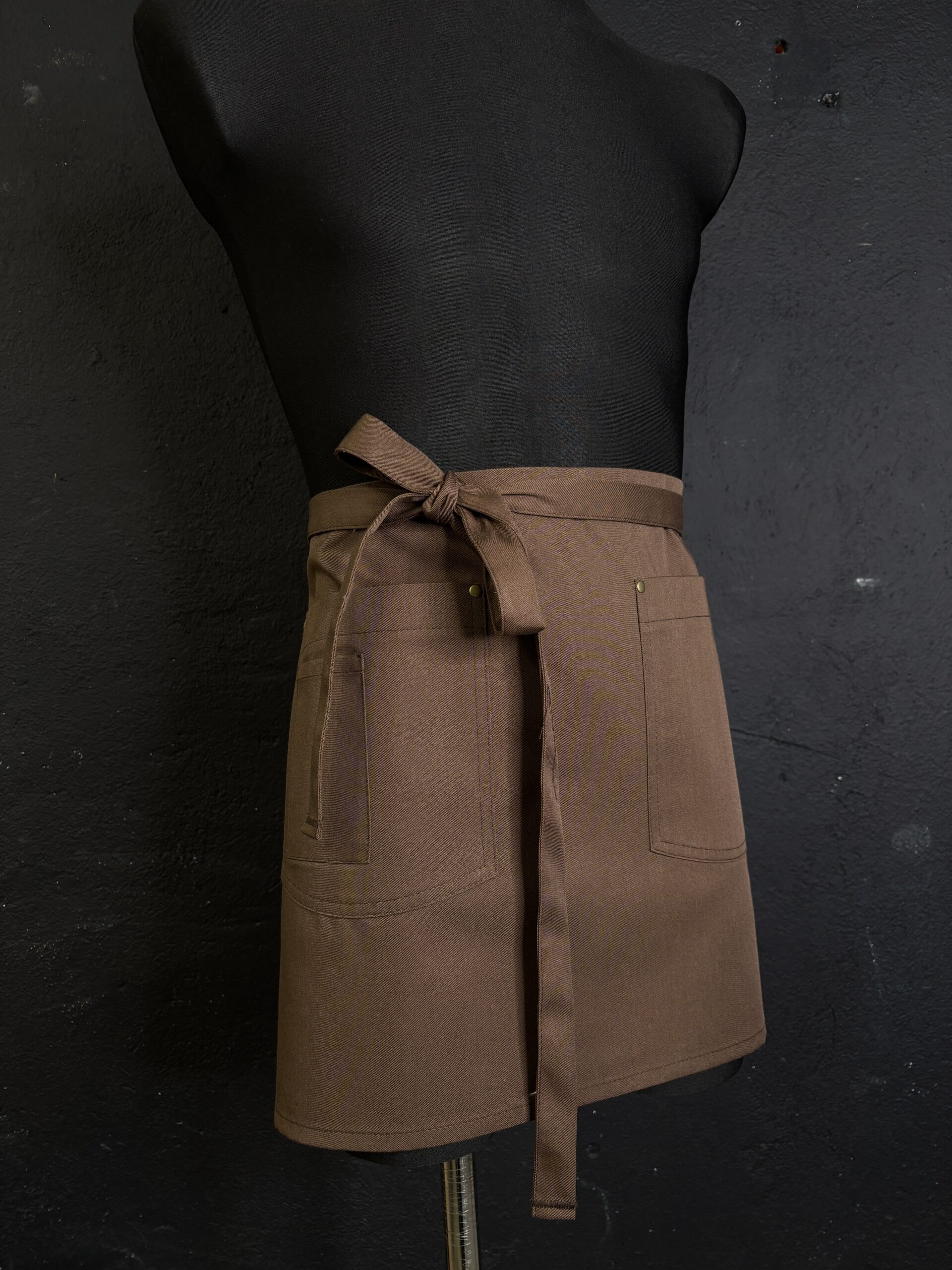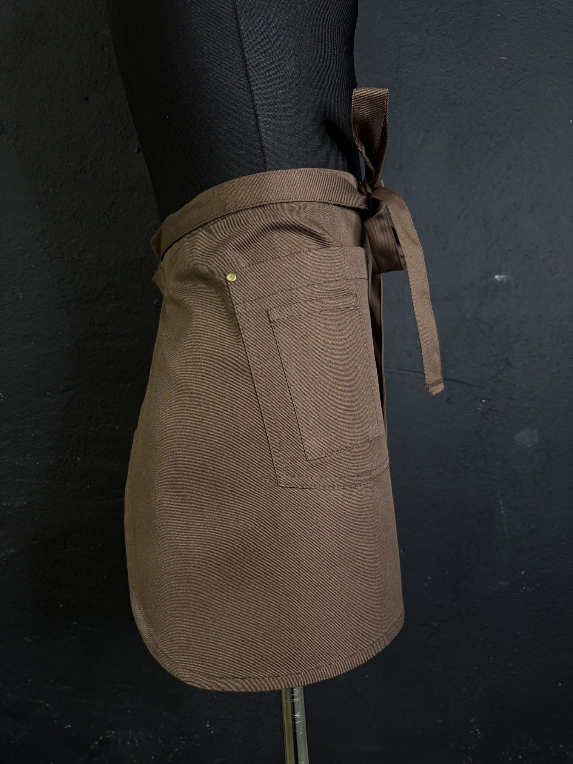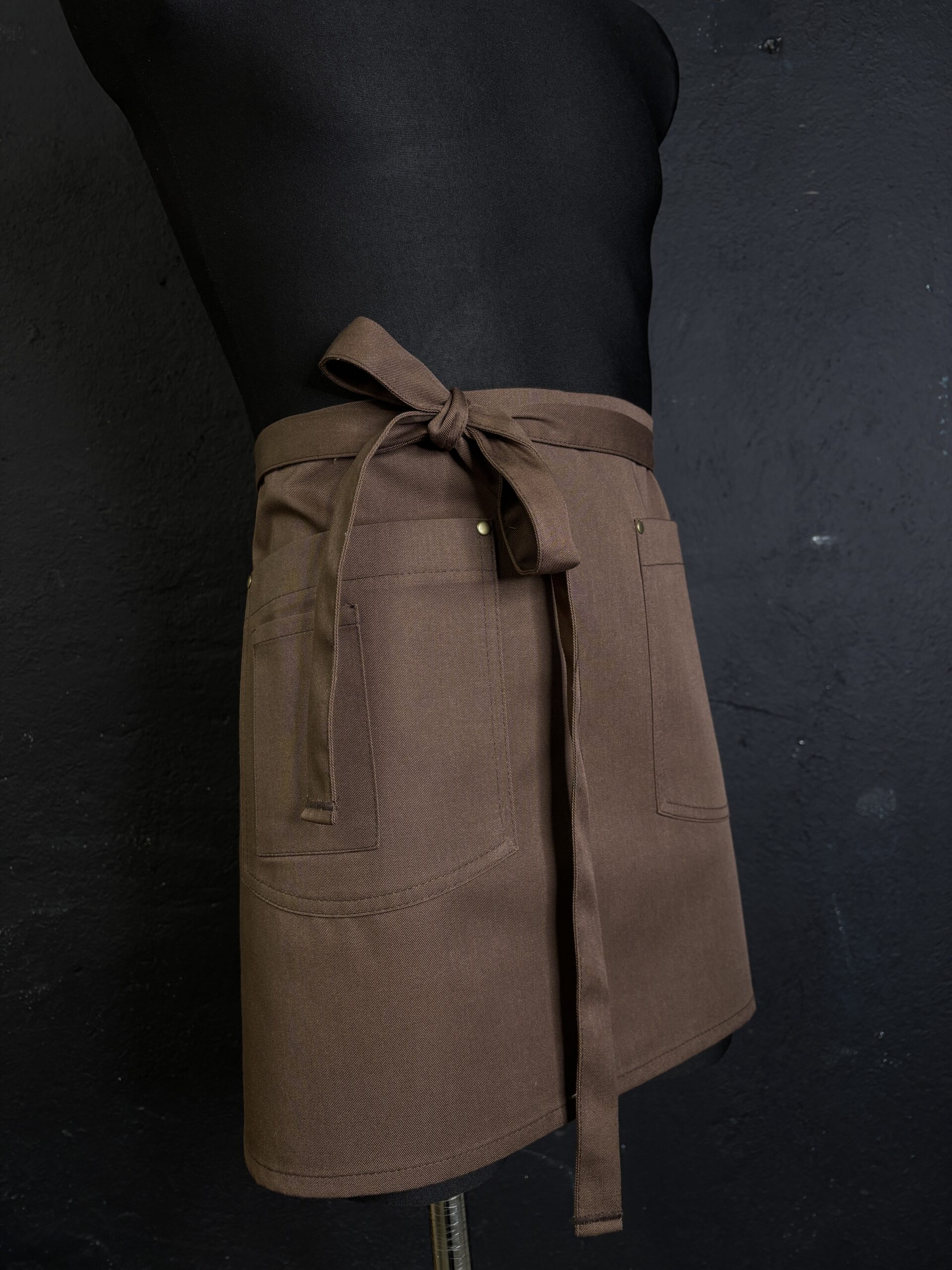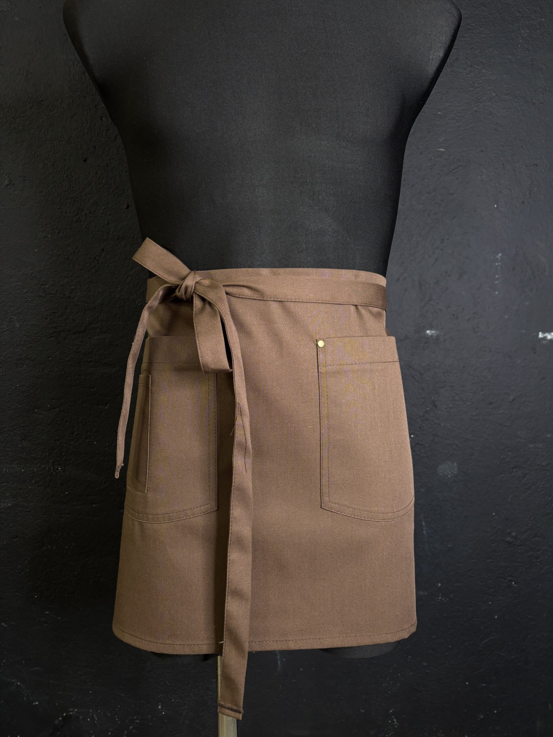 Piękna brązowa zapaska z kieszeniami. Wygodne długie paski. Zaokrąglone rogi dodają elegancji.